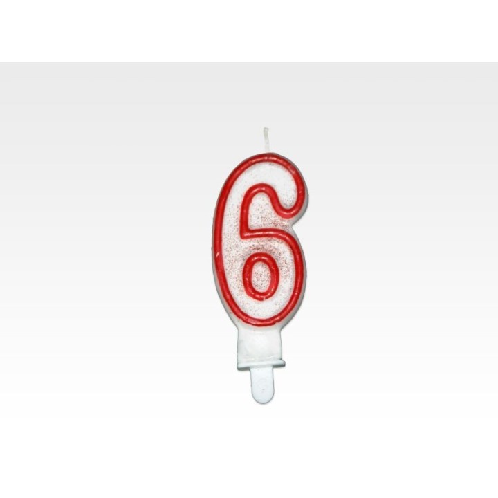 Świeczka - CYFERKA "6", czerwona obwódka z brokatem, cena za 1 szt.