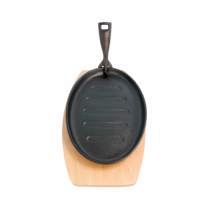 Żeliwny półmisek z drewnianą podstawą owalny żebrowany 27x18x2 cm