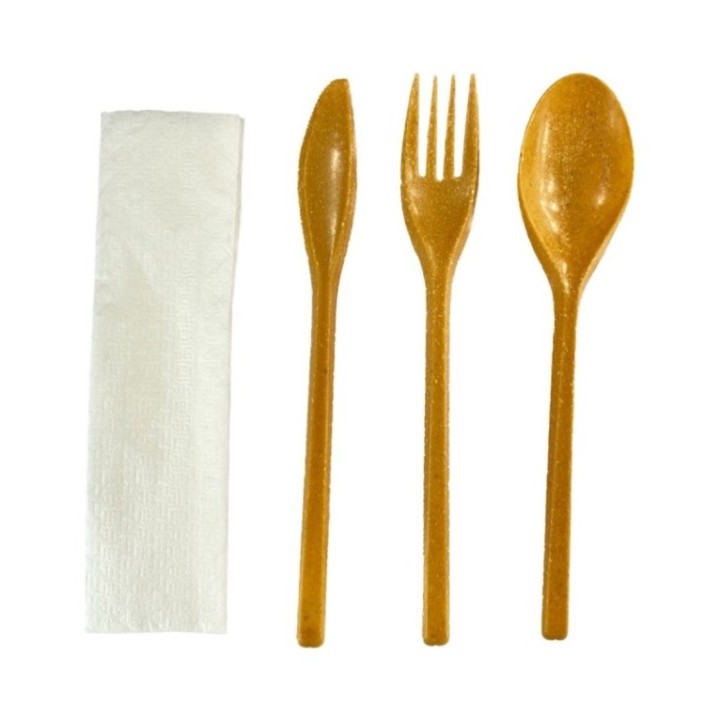 • Konfekcja WPC 1 włókno drewniane, widelec+nóż+łyżka+serwetka w folii, op. 200 szt.