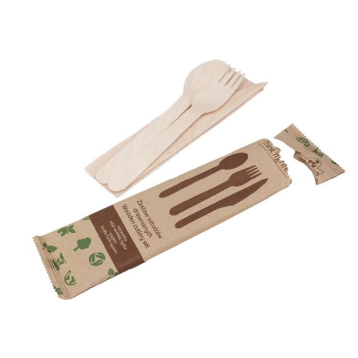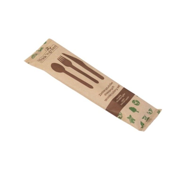 • Konfekcja drewniana 1 papierek op.300 szt. nóż+widelec+łyżka+serwetka, TnG