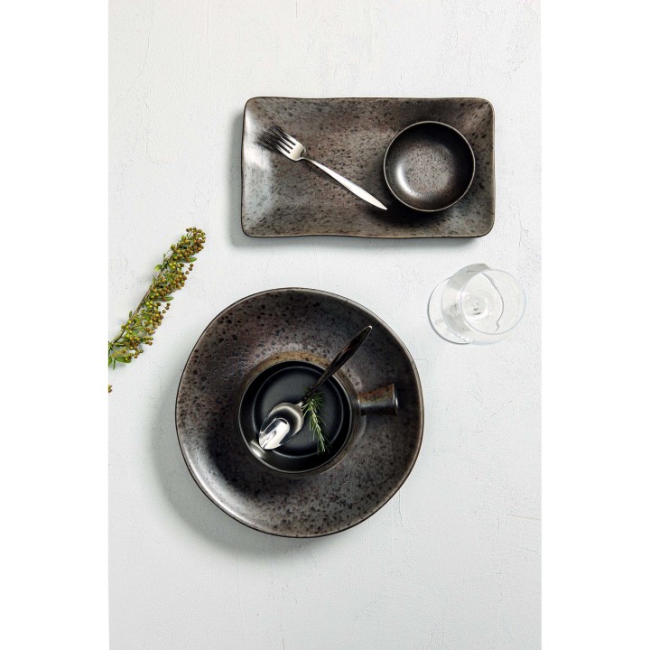 Zastawa Ironstone współgra z wystrojem nowoczesnym, minimalistycznym i loftowym, sprawdzi się idealnie w casualowych restauracjach. Kolekcja składa się z dwóch rodzajów talerzy płytkich w kilku rozmiarach, talerzy głębokich, misek i kubków i jest wykonana z odpornej kamionki wypalanej w bardzo wysokiej temperaturze. Metalizowane akcenty są rozłożone niejednolicie, co przypomina ręcznie malowane naczynia, ta dekoracja świetnie podkreśla wyjątkowość dań i szefa kuchni.
