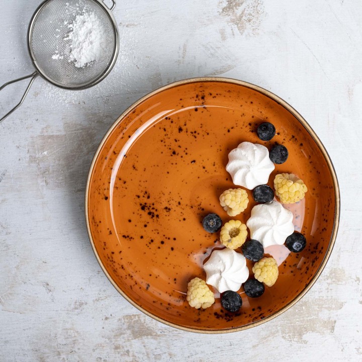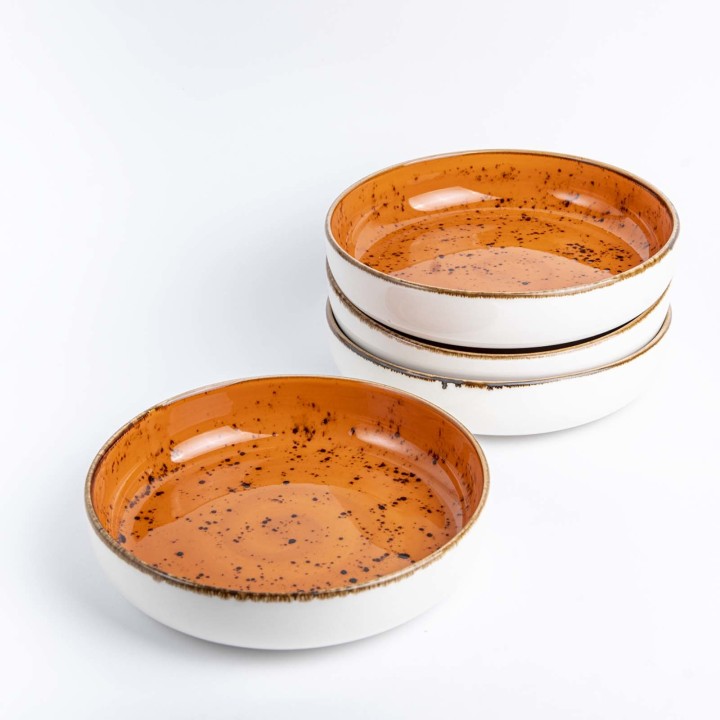 Bogata kolekcja ręcznie zdobionej porcelany w czterech soczystych kolorach. Dopasuj elementy pomarańczowe, niebieskie, szare i oliwkowe, aby uzyskać unikalny i zaskakujący wygląd stołu, a jedzenie będzie prezentować się tak samo dobrze, jak smakuje. Zastawa wytrzymała i odporna, zaprojektowana tak, aby wytrzymać trudy użycia w profesjonalnej kuchni.