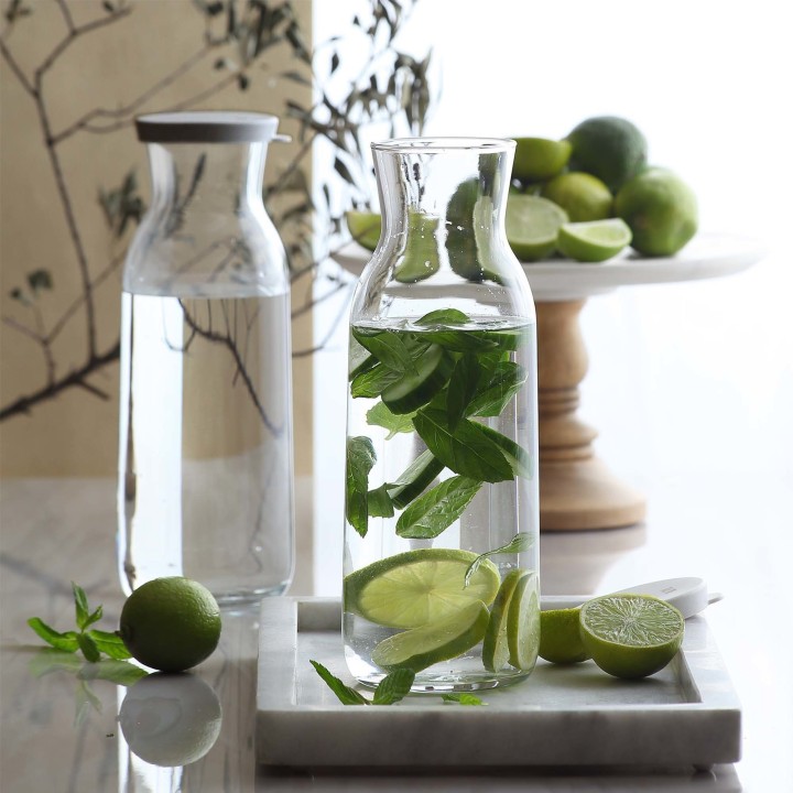 • Soki: Świeżo wyciskane soki owocowe lub warzywne świetnie się prezentują w karafce z pokrywką. Dzięki pojemności 700 ml można podać większą ilość soku, co ułatwia obsługę większej liczby gości.