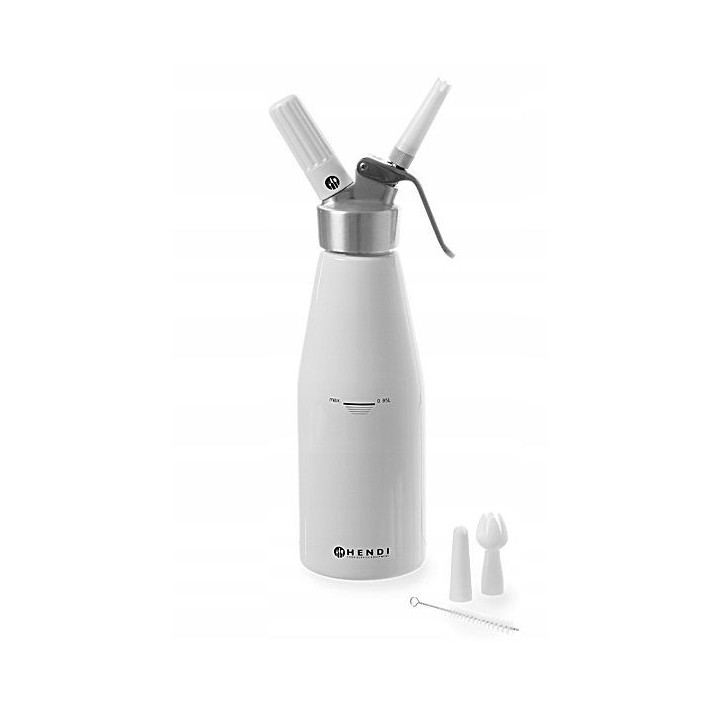 Uniwersalny syfon - do profesjonalnego użytkuOdpowiedni do przygotowywania bitej śmietany, kremów, musów i zimnych sosówDo użytku z nabojami (N2O) do syfonów do bitej śmietany (naboje nie są dołączone do zestawu)W zestawie: 3 końcówki z polipropylenu i szczoteczkaOdpowiedni do: Zmywarka do naczyń, Mikrofalówka, BemarMateriały: AluminiumWysokość (mm): 320Średnica (mm):  95
